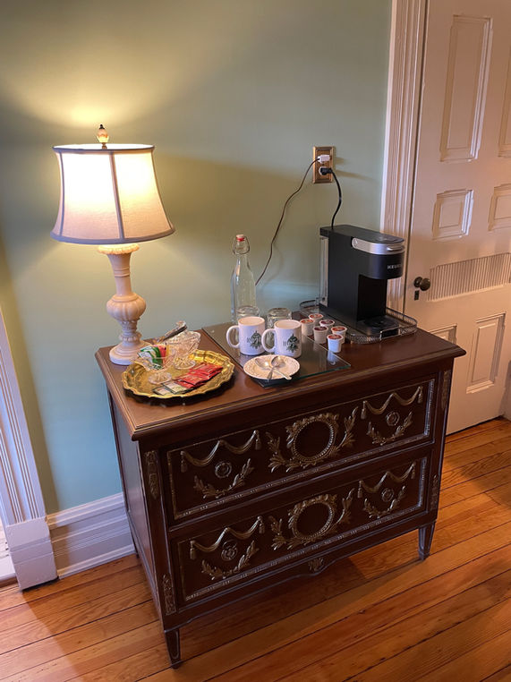Come and enjoy this beautiful second floor room with all its Victorian touches original to the mansion. In conjunction there is an en suite bathroom with walk in shower and soaking tub for your enjoyment. After a nice relaxing shower get comfortable in your provided robes and enjoy our complimentary treats with coffee, tea, or wine